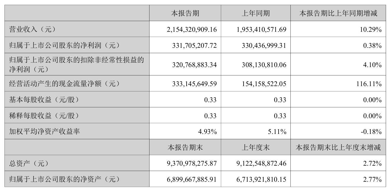 2025年上半年,公司生意收入为21.54亿元,同比增长10.29%;归母净利润为3.32亿元,同比增长0.38%;扣非归母净利润为3.21亿元,同比增长4.10%。