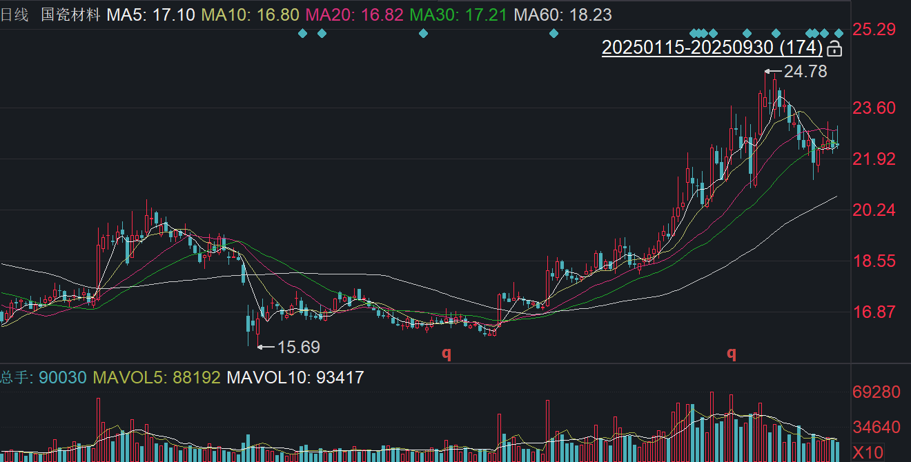 二级商场上,收尾9月30日收盘,国瓷材料高涨0.22%报22.32元/股,总市值为222.54亿元,本年来公司股价高涨超三成。