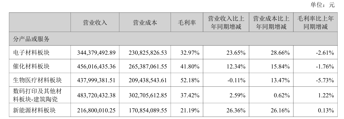 具体来看,公司多类主要家具毛利率出现下滑,电子材料板块、催化材料板块、生物医疗材料板块诀别同比减少2.61%、1.76%、5.73%。