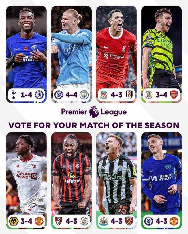 英超官方列出本赛季最好比赛的候选名单欧洲杯app,最好比赛将由球迷投票选出。